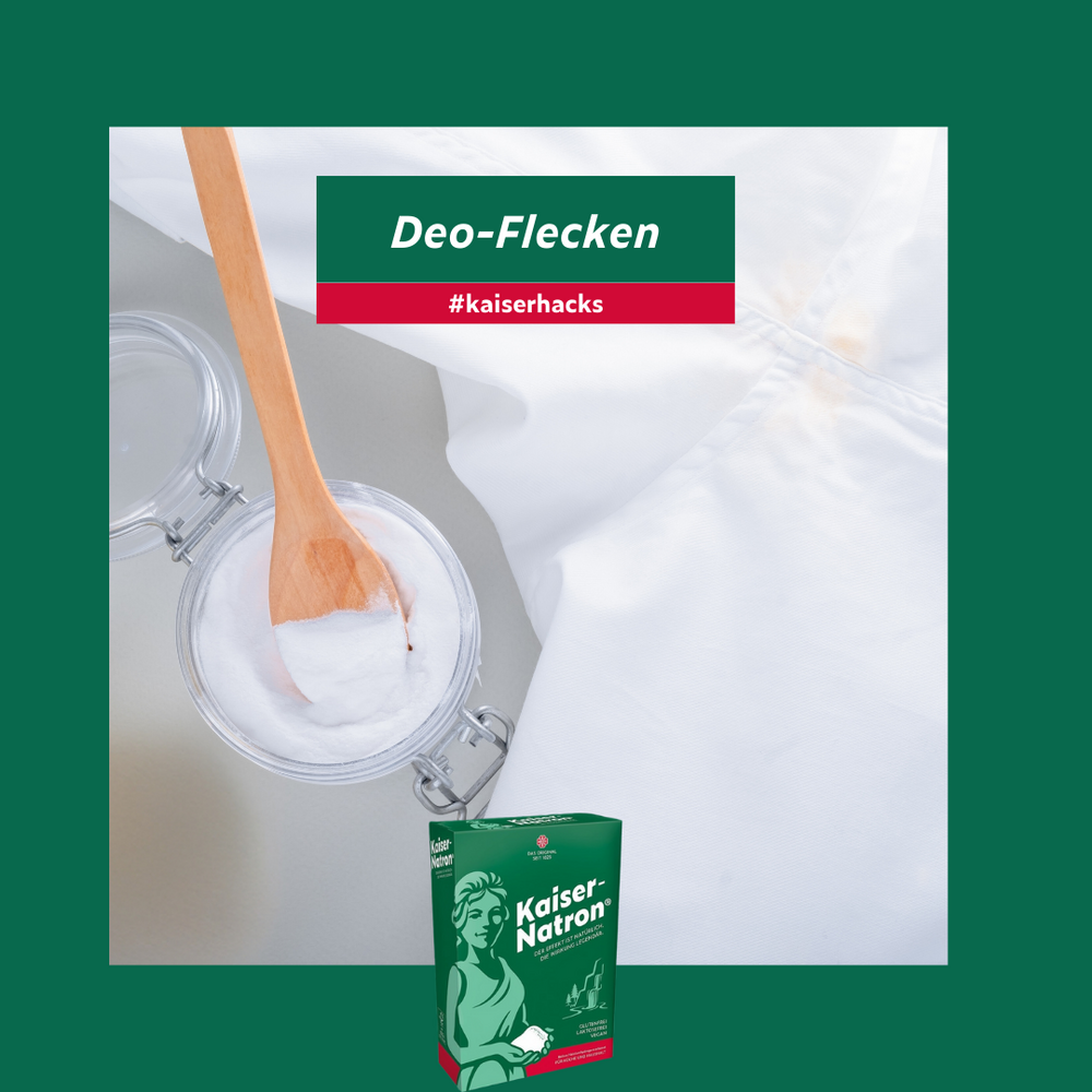 Deos sind oft Fluch und Segen zugleich. Sie verhindern, dass Gerüche entstehen und gleichzeitig können sie unschöne gelbliche Deo-Flecken auf der hellen Kleidung hinterlassen. Diese Flecken entstehen durch die chemische Reaktion der Salze des Deos, des Schweißes und der Tenside der Waschmittel. Aber egal, wie sie entstehen, wichtig ist vor allem, wie sie wieder verschwinden. Natürlich mit unserem Alleskönner Kaiser-Natron®. Dazu mischt Ihr eine Paste aus Kaiser-Natron® und etwas Wasser an, verteilt diese auf den Deo-Flecken und lasst es 1-2 Stunden einwirken. Anschließend auswaschen und wie gewohnt waschen. Natron ist nicht für Wolle und Seide geeignet.