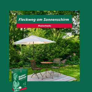 Wer kennt es nicht, gerade alles im Garten zum Grillen vorbereitet, kommt ein plötzlicher Sommerregen und der Sonnenschirm muss fix zugemacht werden. Bleibt der Schirm nun länger geschlossen, können Stockflecken entstehen. Aber keine Panik, unser Zauberpulver Kaiser-Natron® hilft Euch da schnell und einfach. Für diesen Kaiserhack vermischt Ihr Wasser mit Kaiser-Natron® zu einer breiigen Paste, tragt diese auf die betroffenen Stellen auf und lasst es einige Zeit einwirken, bevor Ihr die Paste wieder abwascht. Probiert es am besten erst einmal auf einer verdeckten Stelle aus.