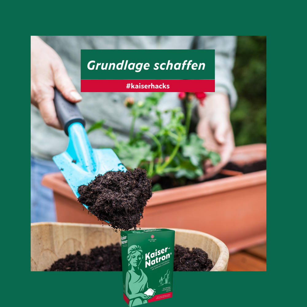 Damit die Töpfe wieder aussehen wie neu, könnt Ihr die Töpfe ohne die Bepflanzung für mehrere Stunden in ein warmes Natron-Bad geben. Pro Liter Wasser gebt Ihr 2 EL Kaiser-Natron® ins Bad.